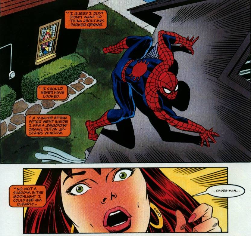 It’s the ending, where Spider-man’s mask is ripped off by Dr. Octopus while Mary Jane is held prisoner on the other side of the room. Then he turns around, no mask, and she realizes, with her trademark shocked look, “OMG. Peter Parker IS Spider-man.”